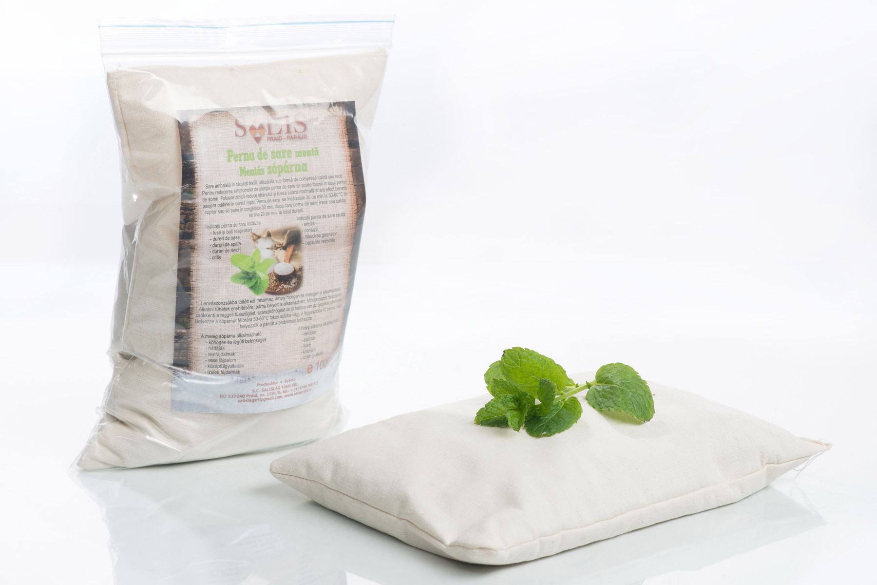 Sare ambalată în săculeţi textili, utilizabilă sub formă de compresă caldă sau rece.