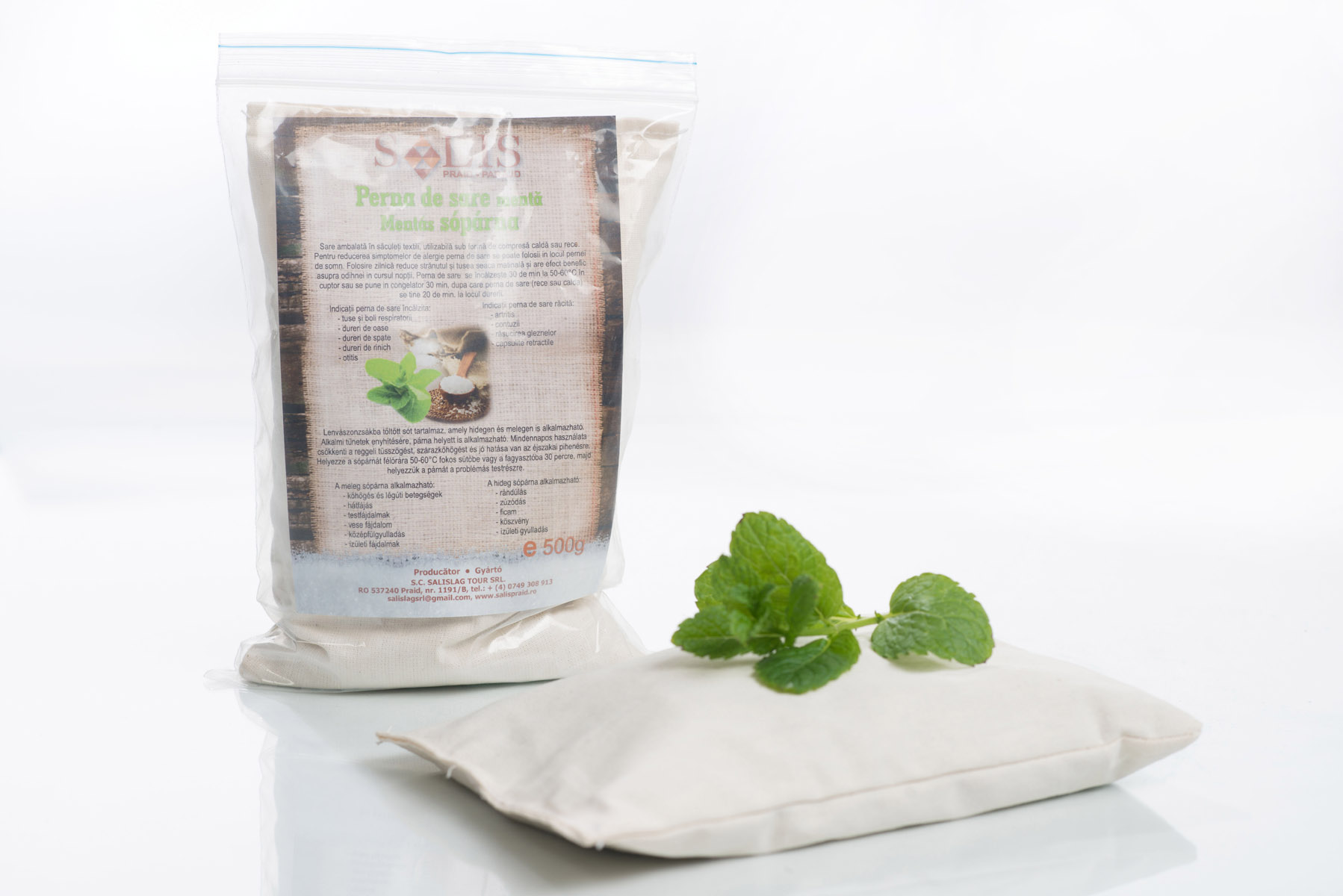 Sare ambalată în săculeţi textili, utilizabilă sub formă de compresă caldă sau rece.